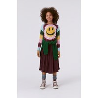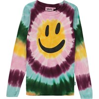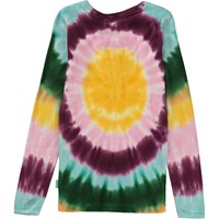 Veelkleurige longsleeve met een tie-dye print. De tie-dye print is in heldere kleuren blauw, groen, geel en roze. Het geel in het midden is een zon met stralen die vrolijk naar je uitreiken. De longsleeve is van 100% katoen, heeft een ronde hals en is slim fit. De tie-dye print van Molo is uniek en handgemaakt, waardoor de print per stijl kan verschillen.
