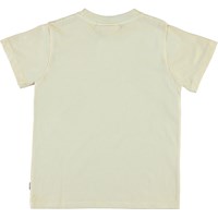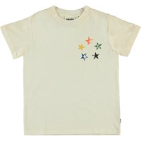 Reeve is een wit t-shirt met kleine, kleurrijke sterren aan één kant van de borst.