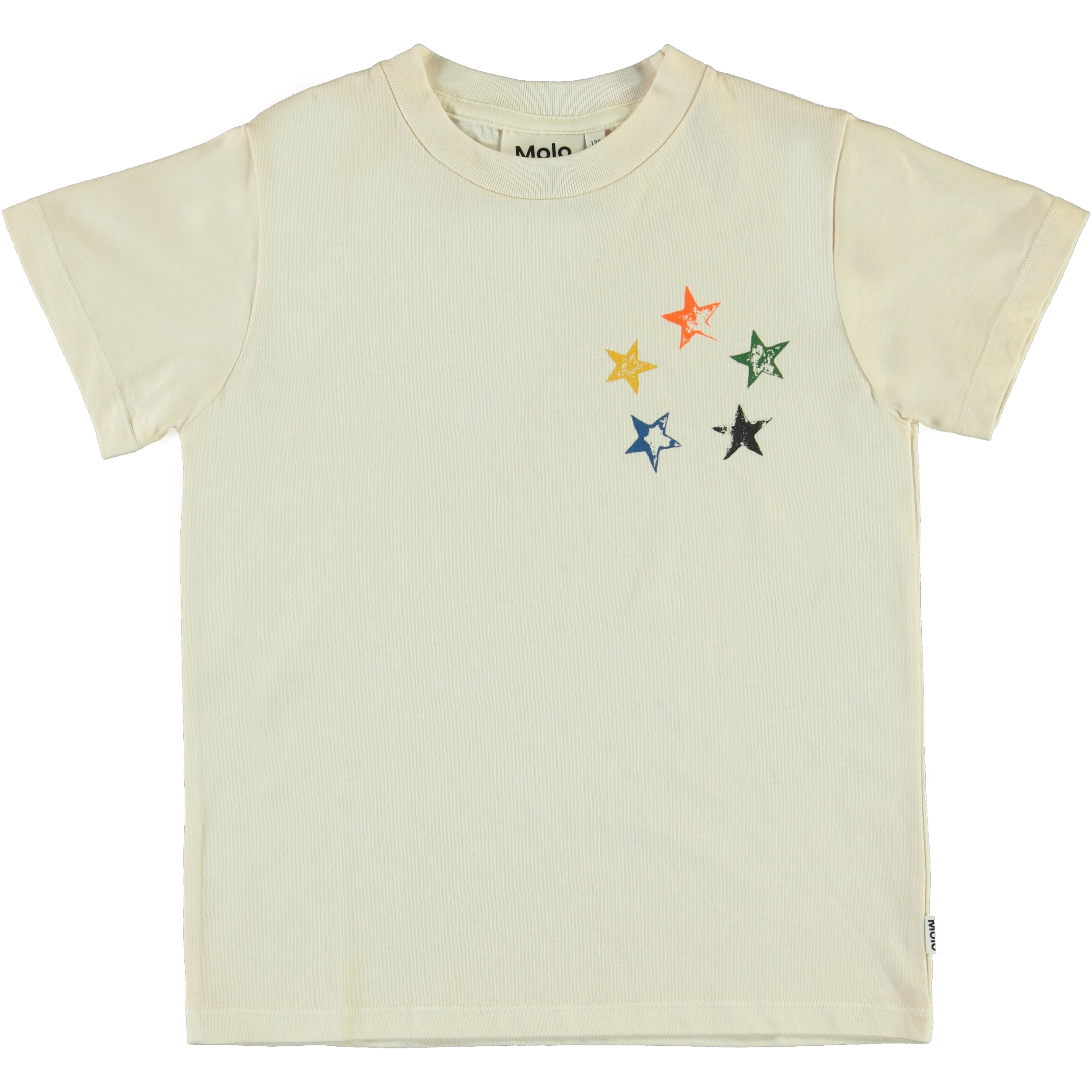 Reeve is een wit t-shirt met kleine, kleurrijke sterren aan één kant van de borst.