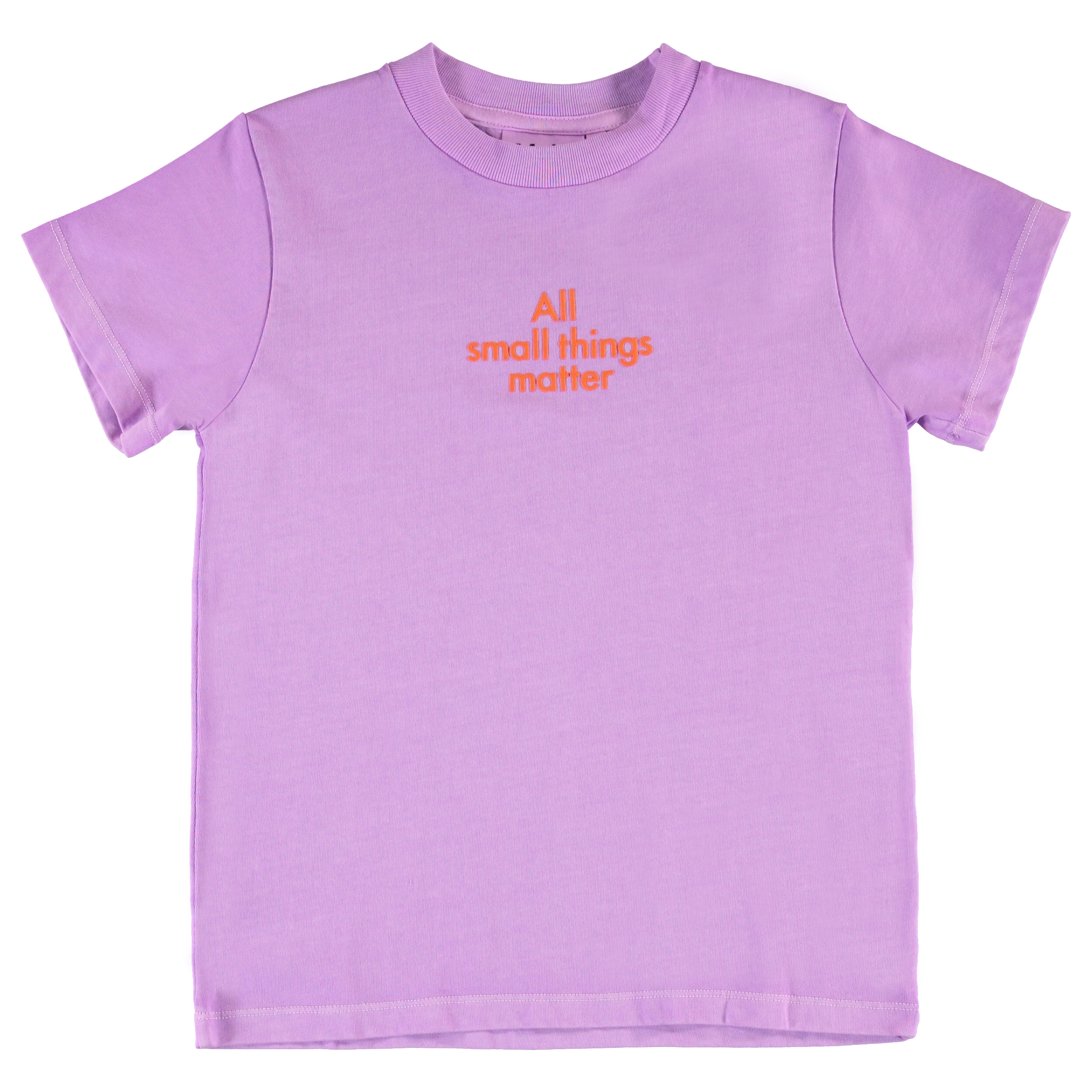 Reeve is een paars t-shirt met de tekst ‘All small things matter’ op de voorkant.