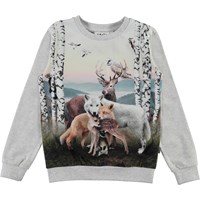 Regine is een lichtgrijze shirt met lange mouwen en een print van knuffelende bosdieren.