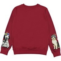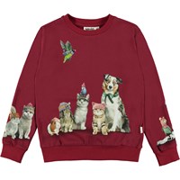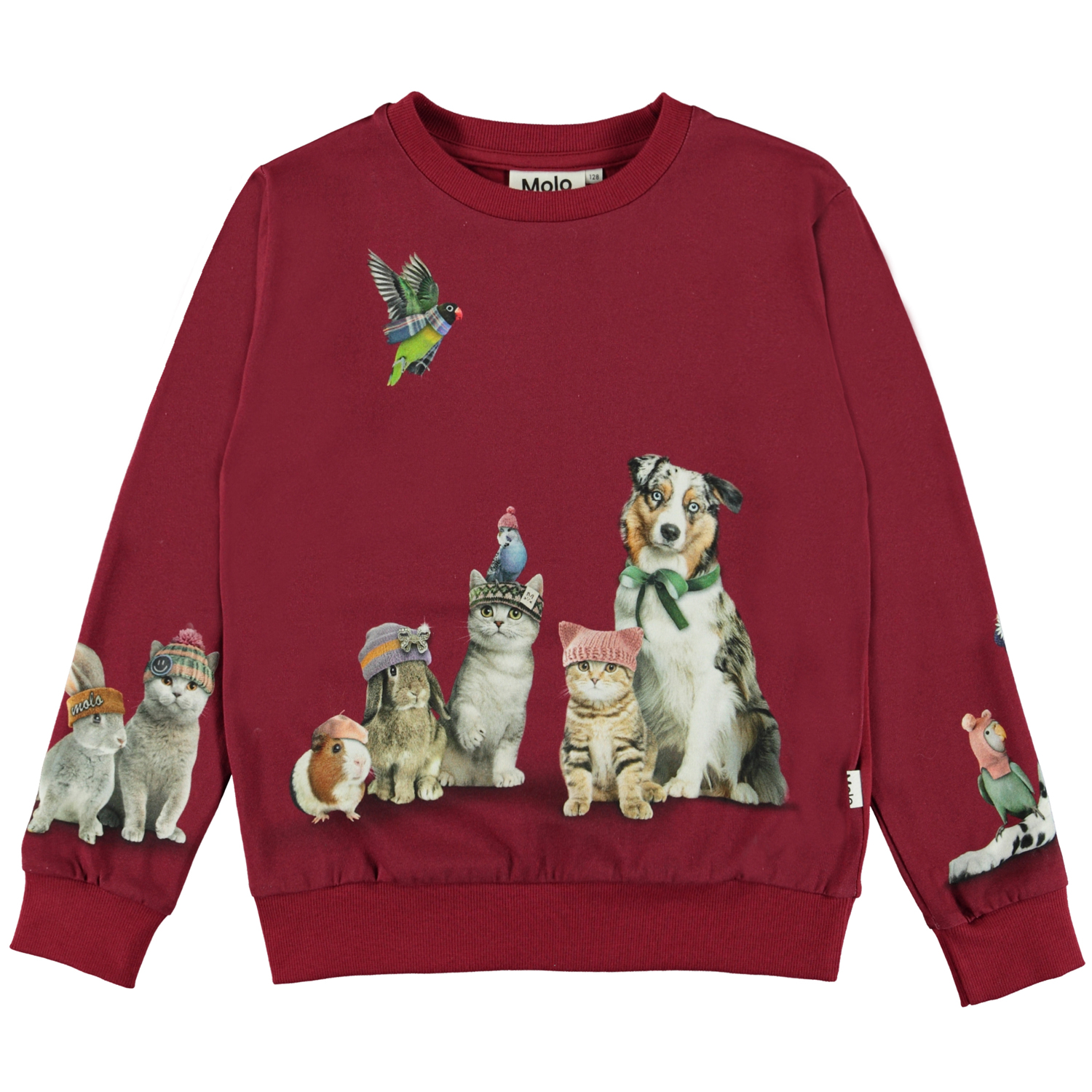 Dit is een donkerrode Regine sweater. De dieren poseren, wachtend tot hun familiefoto wordt geschoten. Er is een hond, katten, konijnen en een vogel, de meeste dragen een muts.