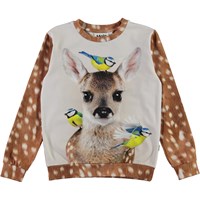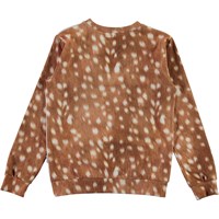 Regine is een bruine shirt met lange mouwen en witte vlekken die lijken op de vacht van een hert. Op de voorkant zit een lichtgekleurde print van een hertje met vogels die er omheen vliegen.