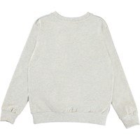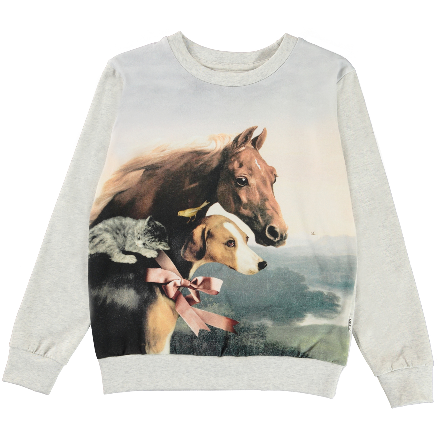 Regine is een lichtgrijze sweater met op de voorkant een print van een paard, hond, kat en vogel.
