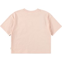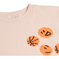 Roze T-shirt gemaakt van zachte, biologische katoen met een ronde hals en ribboord. Het T-shirt heeft een ruimvallende pasvorm en mouwen die zacht over de schouders vallen en op de borst staan kleine oranje basketballen van pailletten.