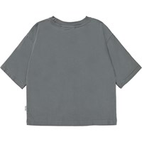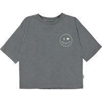 Reinette is een donkergrijs t-shirt van biologisch katoen. De voorkant heeft een print met de tekst "I Love Earth" die een lachend gezicht vormt.
