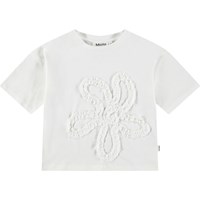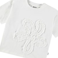 Wit t-shirt van zacht biologisch katoen met ribboord rond de hals. Het t-shirt heeft een ruimvallende pasvorm met op de voorkant een in stof geborduurde bloem.