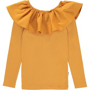 Renate is een gouden top met lange mouwen in ribstof met een grote ruches kraag die zowel op als off-shoulder gedragen kan worden.