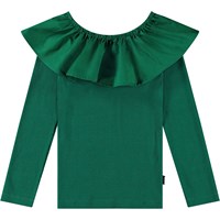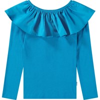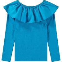 Turquoise, getailleerde top met lange mouwen van biologisch katoenen ribstof, met een popeline kraag en elastiek, die off-shoulder gedragen kan worden of omhoog getrokken kan worden om zowel als kraag en mouw te functioneren.