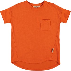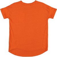 Renessa is een oranje t-shirt met een ronde hals en een borstzak. Het t-shirt heeft een iets oversized pasvorm.