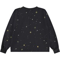 Zwarte longsleeve gemaakt van zacht biologisch katoen met ribboorden rond de mouwen en hals. De longsleeve heeft een ruimvallende pasvorm en is langer aan de achterkant. De longsleeve heeft een print van gouden sterren en een witte eenhoorn met een kleurrijke bloemenkrans om zijn nek.