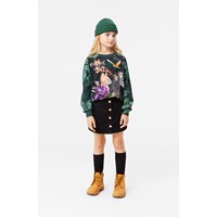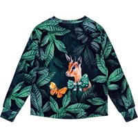 Zwarte en groene trui van biologisch katoen in een ruimvallende pasvorm met ronde hals en geribbelde boorden. De trui is langer aan de achterkant dan aan de voorkant. De print is een all-over print met frisse groene bladeren en feestelijke dieren op de voorkant van het shirt.