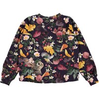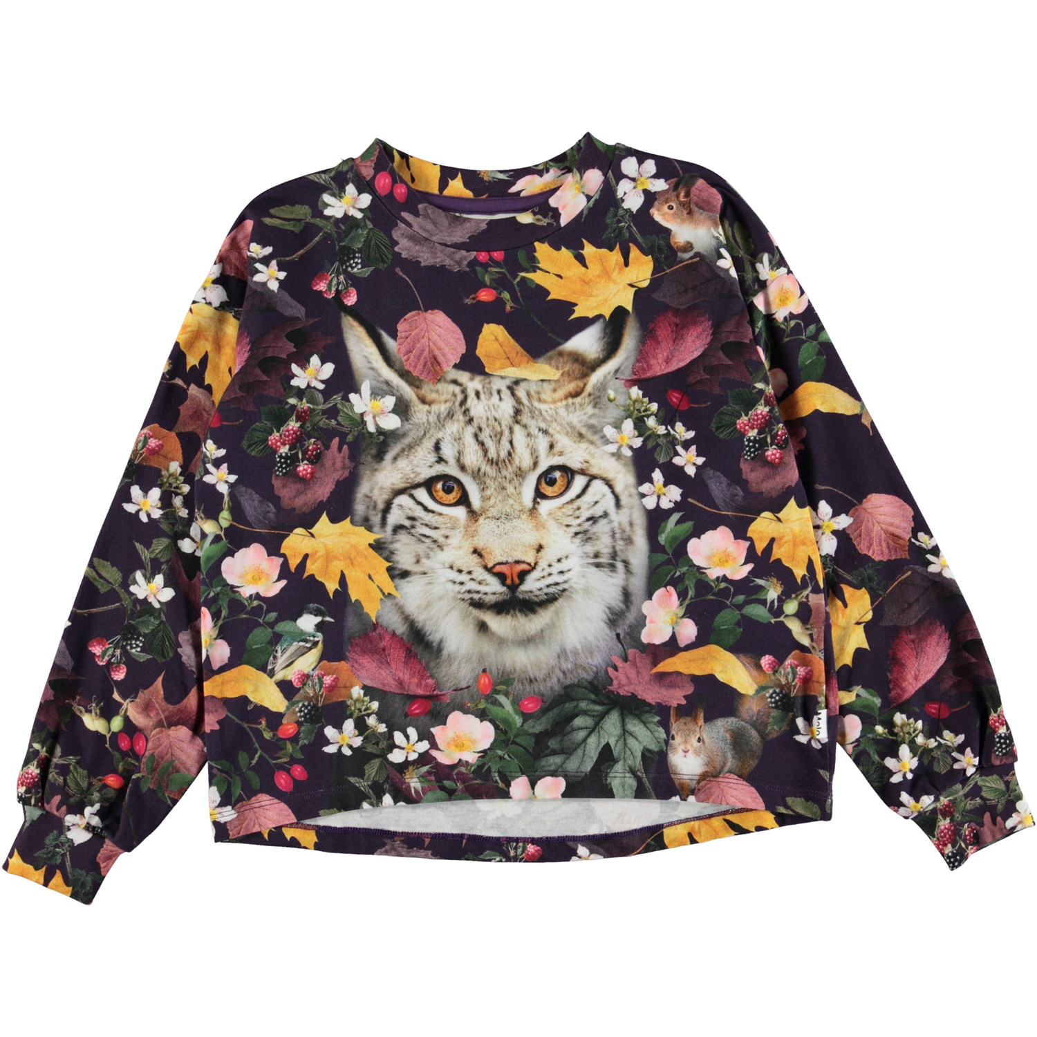 Reniza is een paarse sweater met een print van een lynx tussen kleurrijke bramen. De sweater is een beetje langer aan de achterkant.