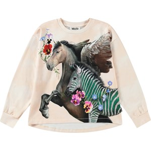 Witte en zalmroze trui van biologisch katoen. De trui heeft een ruimvallende pasvorm, een ronde hals en geribbelde boorden. De achterkant van de trui is langer dan de voorkant. Op de voorkant staat een feestelijke print van een paard met vleugels en een zebra met groene strepen, beide dragen kleurrijke bloemen in hun mond.