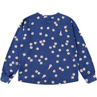 Blauwe trui met van biologisch katoen in een ruimvallende pasvorm met ronde hals en geribbelde boorden. De trui is langer aan de achterkant dan aan de voorkant. Op de voorkant staat een print van een gazelle en een serval kat onder een uitgestrekte sterrenhemel, waar sterren veranderen in bloemen.