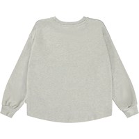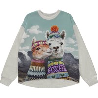Grijsgemêleerde longsleeve met lama print op de voorzijde. De humoristische print toont twee lama's die Molo's eigen breiwerk dragen, en ze dragen allebei een muts, een infinity sjaal en een trui. Deze longsleeve is van 100% katoenen jersey, heeft lange mouwen met een ribboord, een ronde hals met ribboord en heeft een ruimvallende pasvorm.