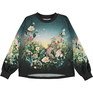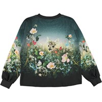 Reniza is een donkergekleurde sweater met een print van bloemen en twee konijnen, die staren naar de sterrennacht. De sweater is een beetje langer aan de achterkant.