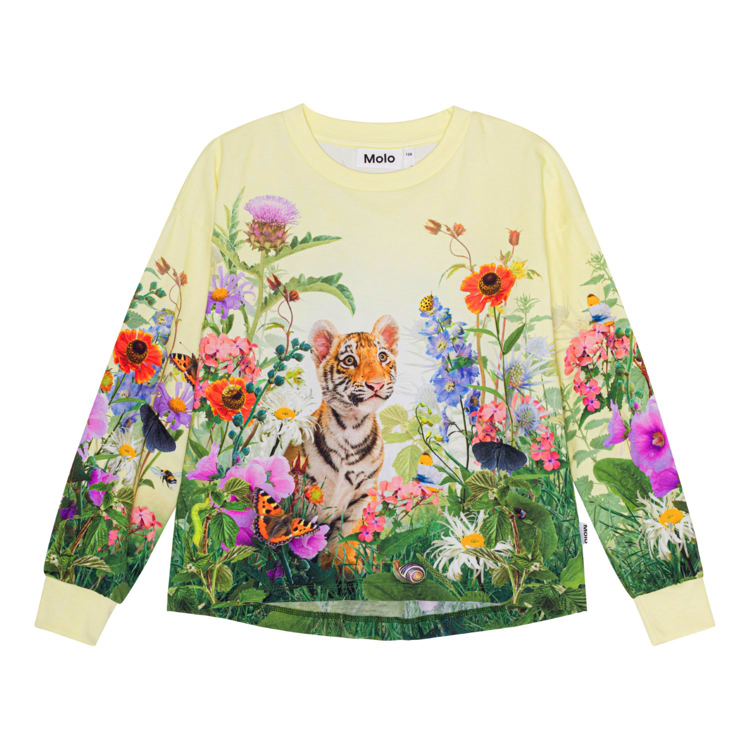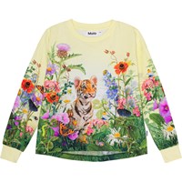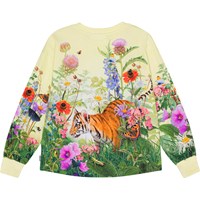 Pastelgele shirt van biologisch katoen met een print van een nieuwsgierige tijgerwelpje in een kleurrijk bloemenweide. Het shirt heeft een ruimvallende pasvorm en een ribboord rond de hals en mouwen. Aan de achterkant is het iets langer.