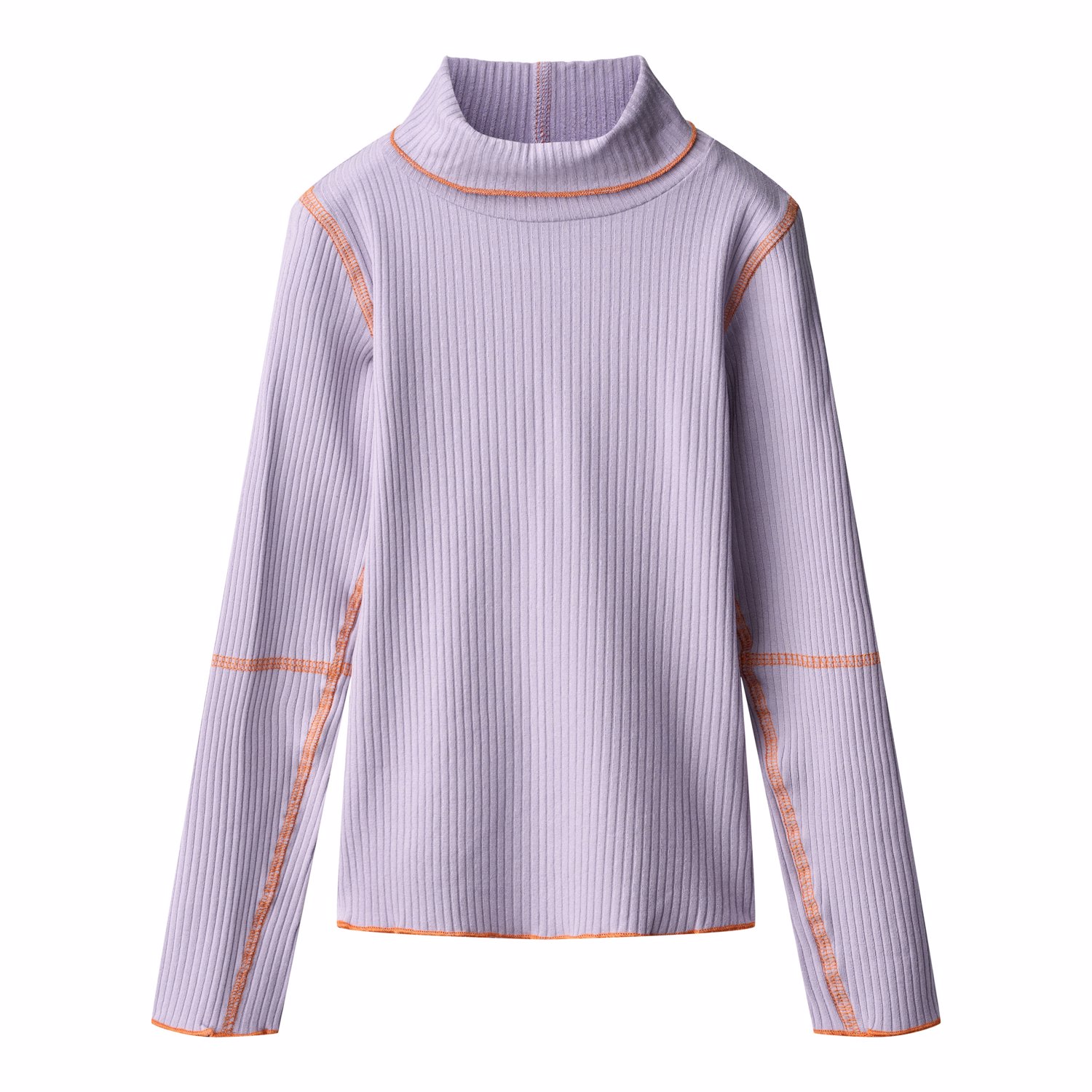 Paarse longsleeve gemaakt van elastische zacht ribkatoen in een aansluitende pasvorm met een opstaande kraag, onbewerkte boorden en zichtbare oranje stiksels.