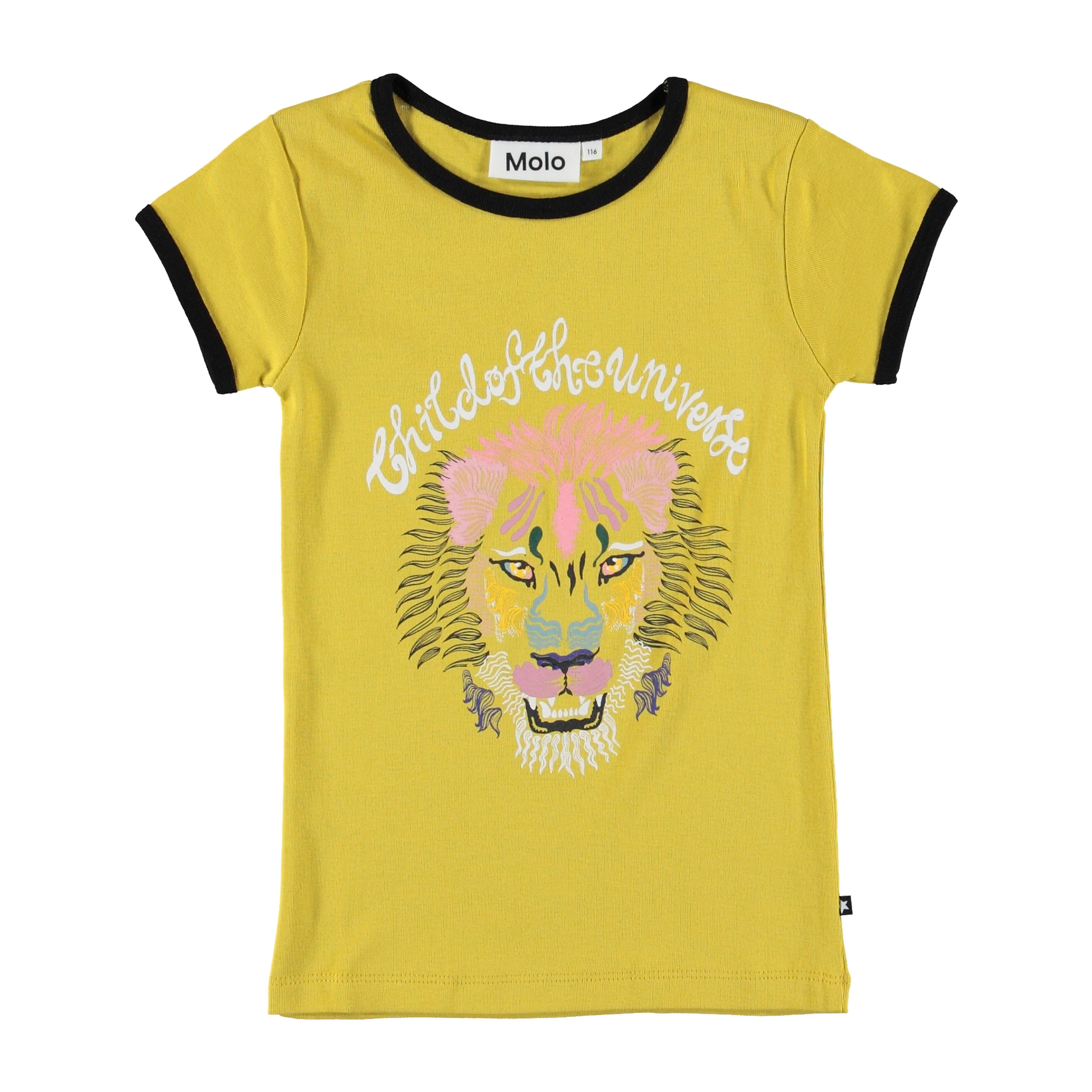 Rhiannon is een ringer t-shirt in geel met een zwarte afgewerkte boord en print op de voorkant.