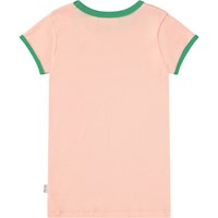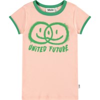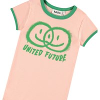 Lichtoranje t-shirt in zacht biologisch katoen met groene boord rond de mouwen en hals. Het t-shirt heeft een aansluitende pasvorm met op de voorkant een groene print van twee lachende gezichten die samensmelten en de tekst 'United Future'.