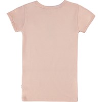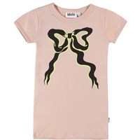 Aansluitende roze t-shirt gemaakt van biologisch katoen met rib boord rond de hals en mouwen. De print op het shirt heeft een grote zwarte strik met gele schaduwen, wat een driedimensionaal effect creëert.