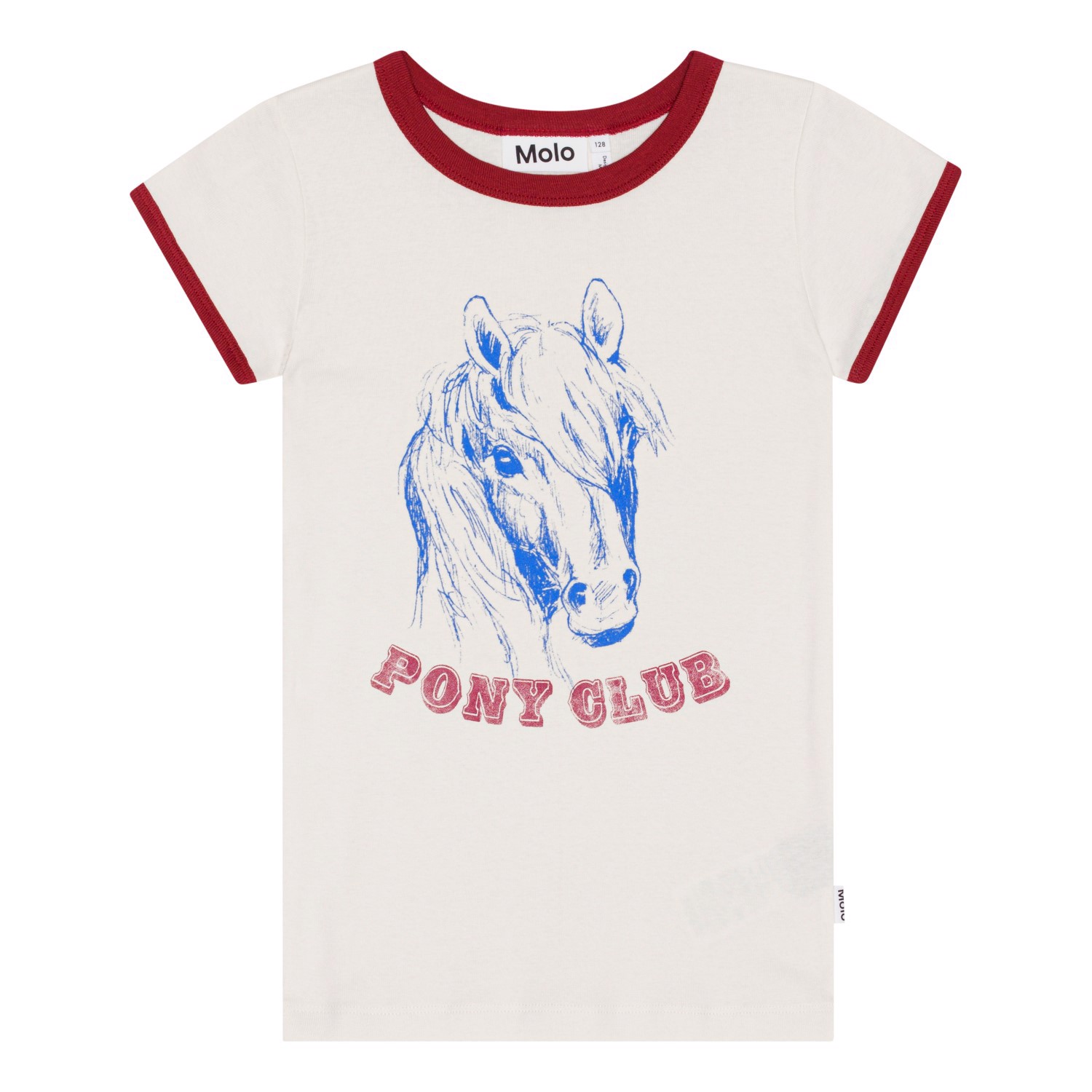 Aansluitende witte t-shirt van biologisch katoen met een prachtige paardenprint. Het t-shirt heeft een bordeauxrode boord rond de hals en mouwen die matcht met de 'Pony Club' tekst op de voorkant.