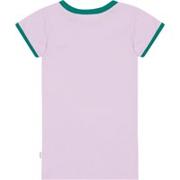 Aansluitend, pastelpaarse t-shirt van biologisch katoen. Het t-shirt heeft groene boorden rond de hals en mouwen, passend bij de print op de voorkant van het t-shirt. De print is gemaakt in de vorm van een logo met 'Team 2024', tennisrackets en bloemen.