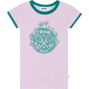 Aansluitend, pastelpaarse t-shirt van biologisch katoen. Het t-shirt heeft groene boorden rond de hals en mouwen, passend bij de print op de voorkant van het t-shirt. De print is gemaakt in de vorm van een logo met 'Team 2024', tennisrackets en bloemen.