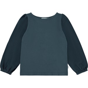 Donkerblauwe top met pofmouwen in katoenen popeline. Deze top is van 100% katoen, heeft een ronde hals met ribboord, lange pofmouwen met elastiek aan de onderkant en een normale pasvorm.