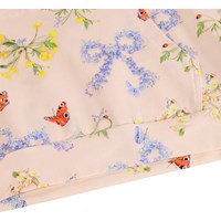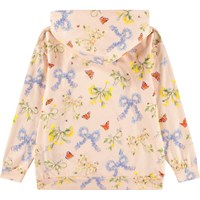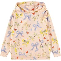 Roze hoodie gemaakt van zachte, biologische katoen met een kangoeroezak en ribboorden rond de mouwen en onderkant. De hoodie heeft een ruimvallende pasvorm en heeft een print van vlinders en kleurrijke bloemen.