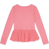 Koraalroze en aansluitende longsleeve van biologisch katoen ribstof met een fluwelen ruche vanaf de taille naar beneden, versierd met een klein uitgesnede bloemenpatroon.