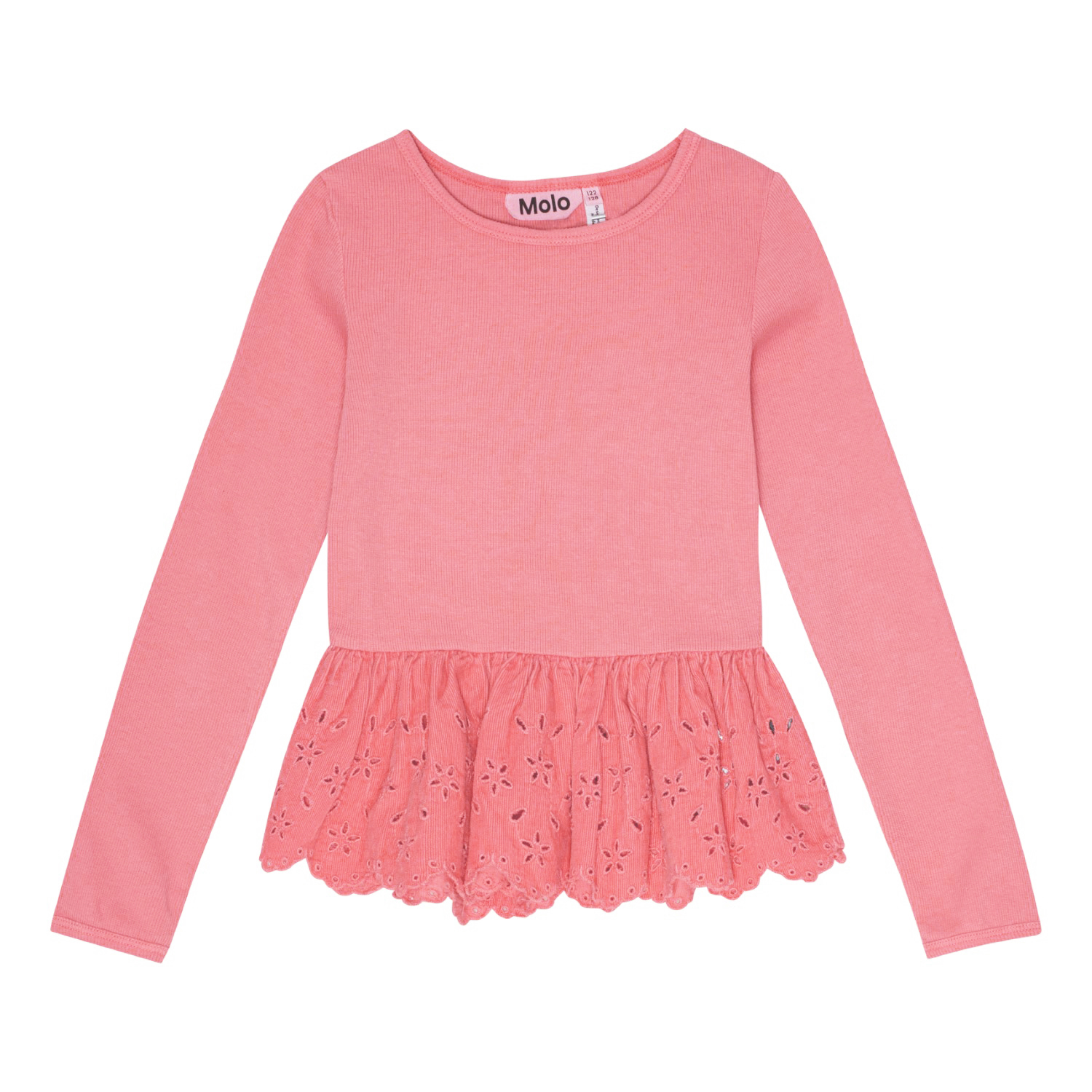 Koraalroze en aansluitende longsleeve van biologisch katoen ribstof met een fluwelen ruche vanaf de taille naar beneden, versierd met een klein uitgesnede bloemenpatroon.