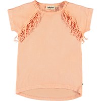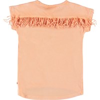 Riana is een zalmkleurige t-shirt met raglanmouwen met franjes. Het t-shirt is langer aan de achterkant.