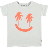 Ribila is een licht en luchtig wit t-shirt van biologisch katoen. Het heeft een print van een koraalkleurige smiley met op de voorkanten van palmbomen.