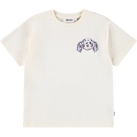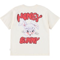 Gebroken witte t-shirt gemaakt van zacht biologisch katoen met een ribboord rond de hals. Het t-shirt heeft een ruimvallende pasvorm en op de achterkant een grote print van een konijn samen met de tekst "Honey Bunny".