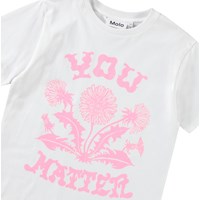 Wit t-shirt van zacht biologisch katoen met korte mouwen en ribboord rond de hals. Het t-shirt heeft een ruimvallende pasvorm en op de voorkant een lichtroze print van paardenbloemen en de tekst 'You Matter'.
