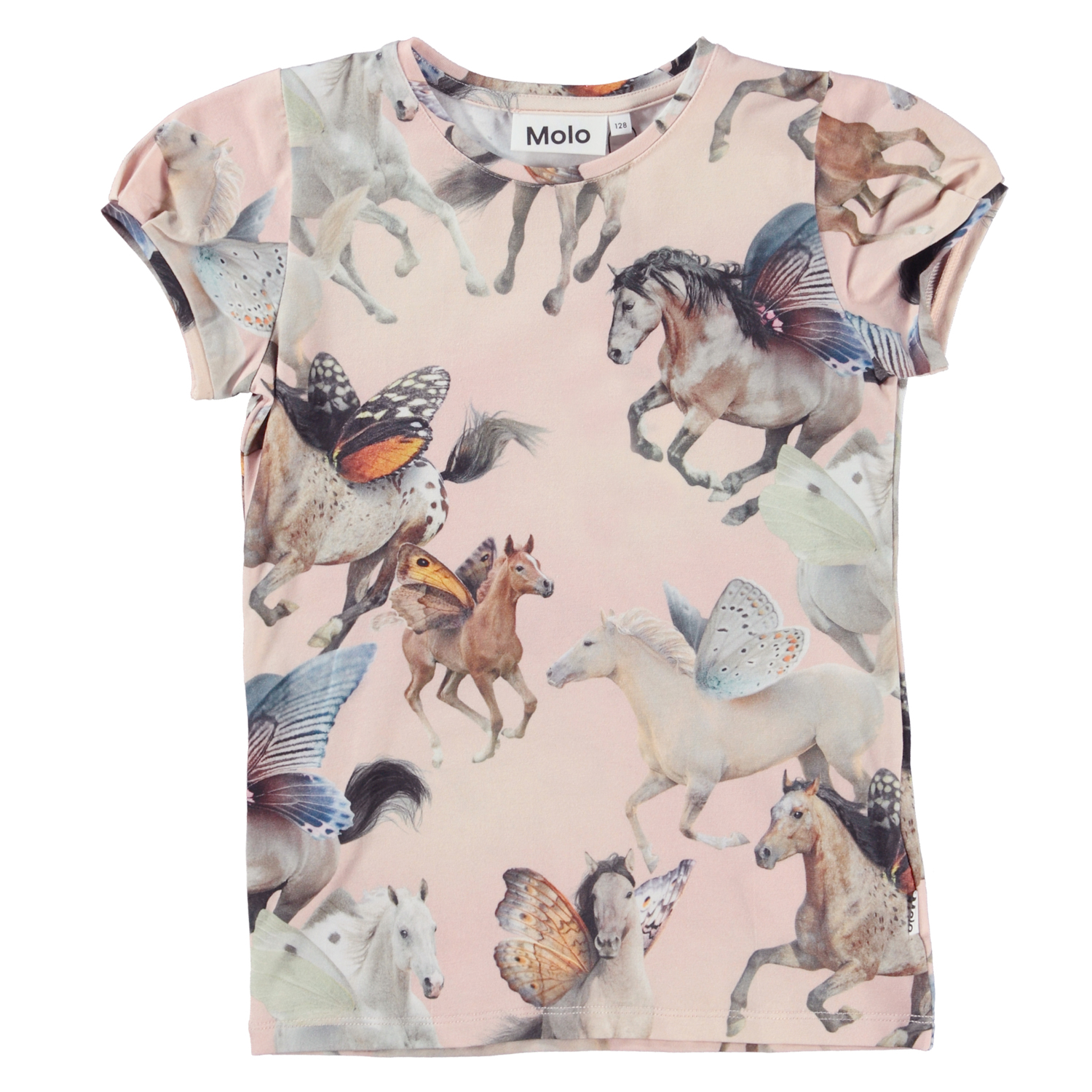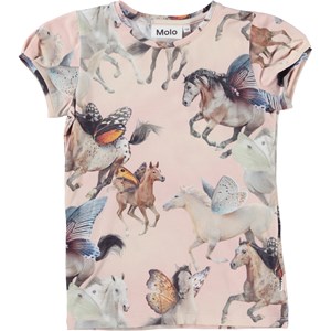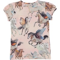 Rimona is een top van biologisch katoen met kapmouwtjes. De top is in de Fairy Horses print, waar paarden met vlindervleugels galopperen.