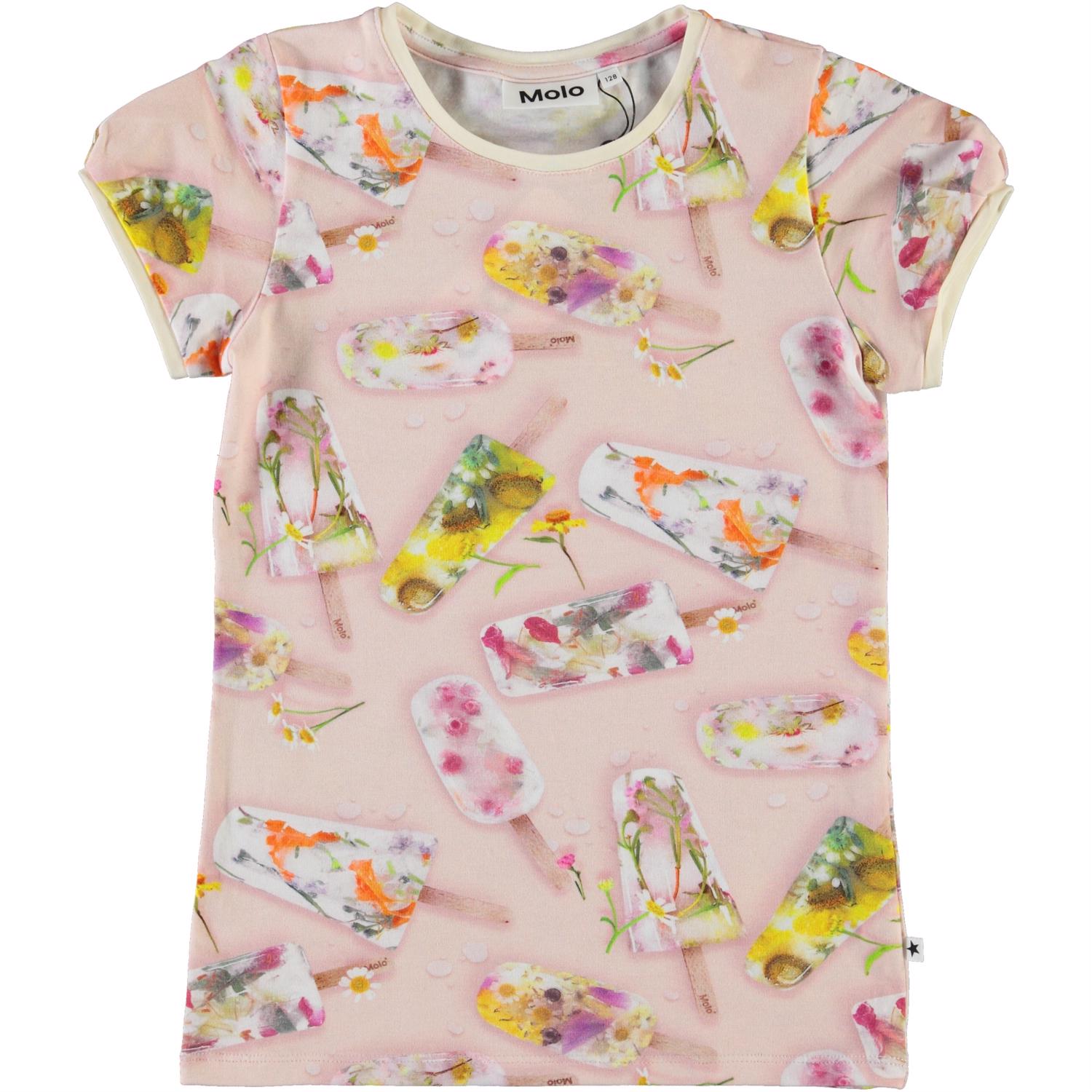 Rimona is een t-shirt met een print van ijsjes. Molo heeft bloemen ingevroren voor deze print. Het t-shirt heeft grijze biesband.