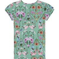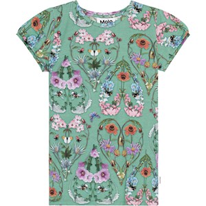 Aansluitende groene t-shirt van biologisch katoen. Het heeft een kleurrijke print van insecten en wilde bloemen in vele kleuren die overal op het t-shirt hartjes vormen. Het t-shirt heeft kleine korte pofmouwen en een ronde hals.
