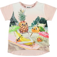 Het fruit is samen op vakantie gegaan naar het strand op het Risha t-shirt. Risha is een roze t-shirt dat langer is aan de achterkant.