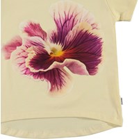 Risha is een gele t-shirt met op de voorkant een bloemenprint. Het t-shirt is aan de achterkant iets langer.