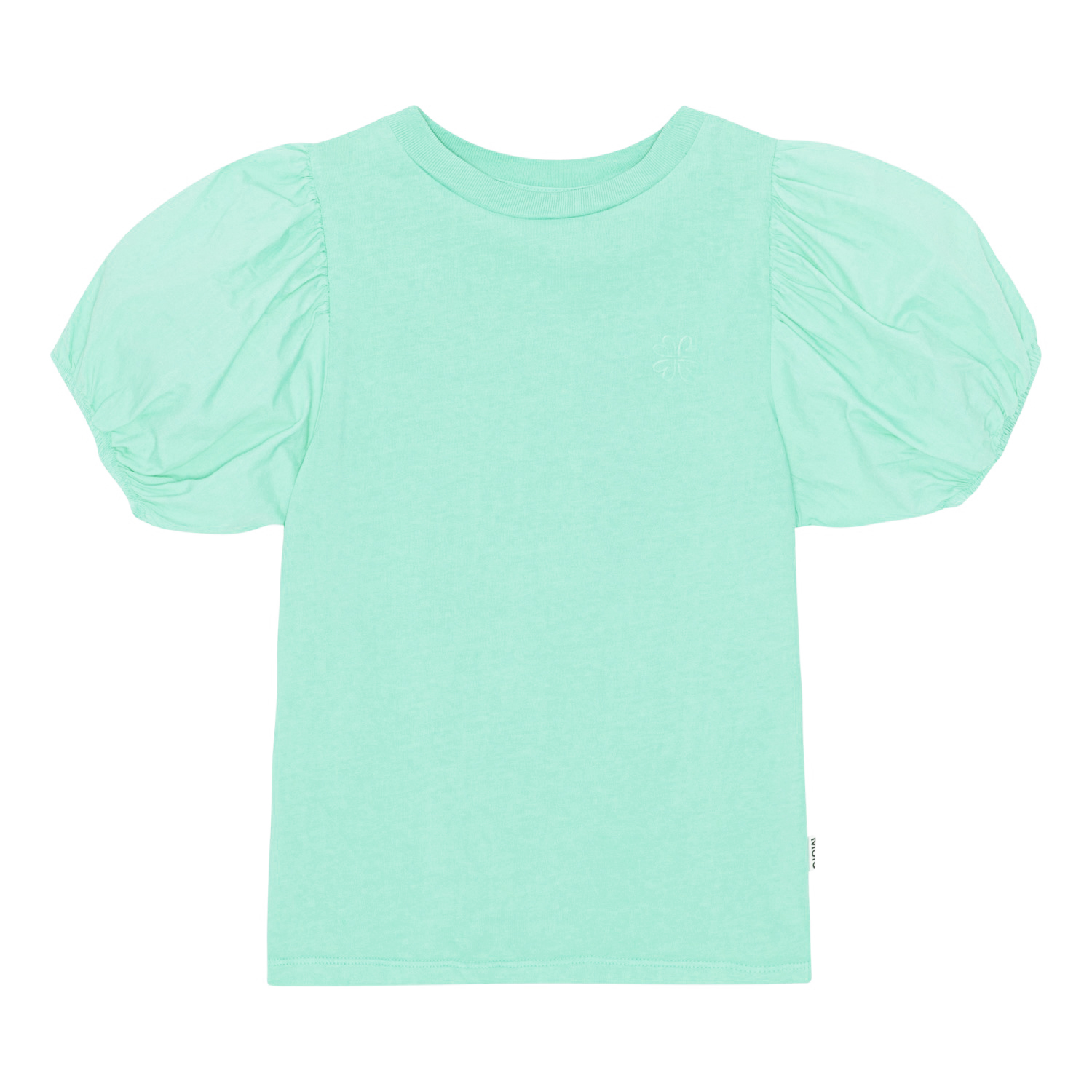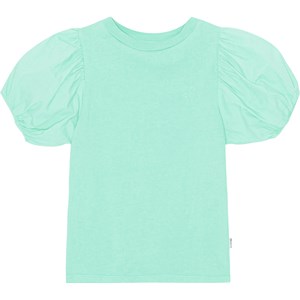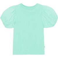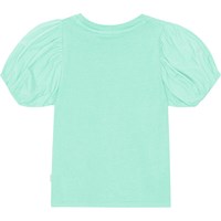 Mintgroen t-shirt van zacht biologisch katoenen jersey met volle korte mouwen van popeline. Op de voorkant staat een kleine print van vier hartjes die een klavertje vier vormen.