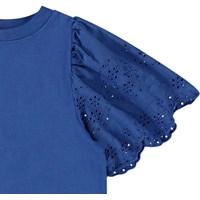 Donkerblauw t-shirt in zacht biologisch katoen met ribboord rond de hals. Het t-shirt heeft een ruimvallende pasvorm en grote vlindermouwen met Engels kant die mooi vallen in het stevige katoen. Combineer het met een bijpassende rok voor een complete set.