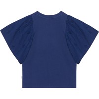 Donkerblauwe top van biologische katoen met korte mouwen met engels kant. De mouwen zijn bovenaan geplooid waardoor een elegant pofeffect ontstaat.