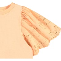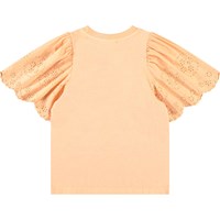 Lichtoranje t-shirt in zacht biologisch katoen met ribboord rond de hals. Het t-shirt heeft een ruimvallende pasvorm en grote vlindermouwen met Engels kant die mooi vallen in het stevige katoen. Combineer het met een bijpassende rok voor een complete set.