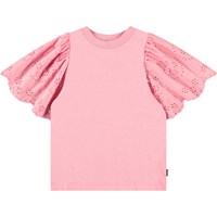 Roze t-shirt in zacht biologisch katoen met ribboord rond de hals. Het t-shirt heeft een ruimvallende pasvorm en grote vlindermouwen met Engels kant die mooi vallen in het stevige katoen. Combineer het met een bijpassende rok voor een complete set.