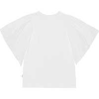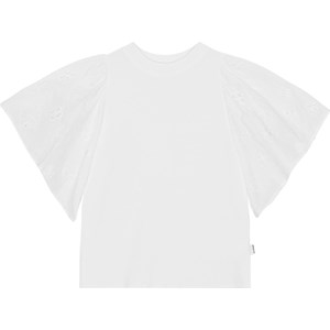 Witte top van biologische katoen met korte mouwen met engels kant. De mouwen zijn bovenaan geplooid waardoor een elegant pofeffect ontstaat.