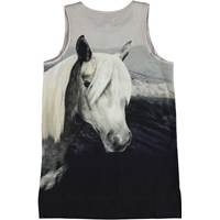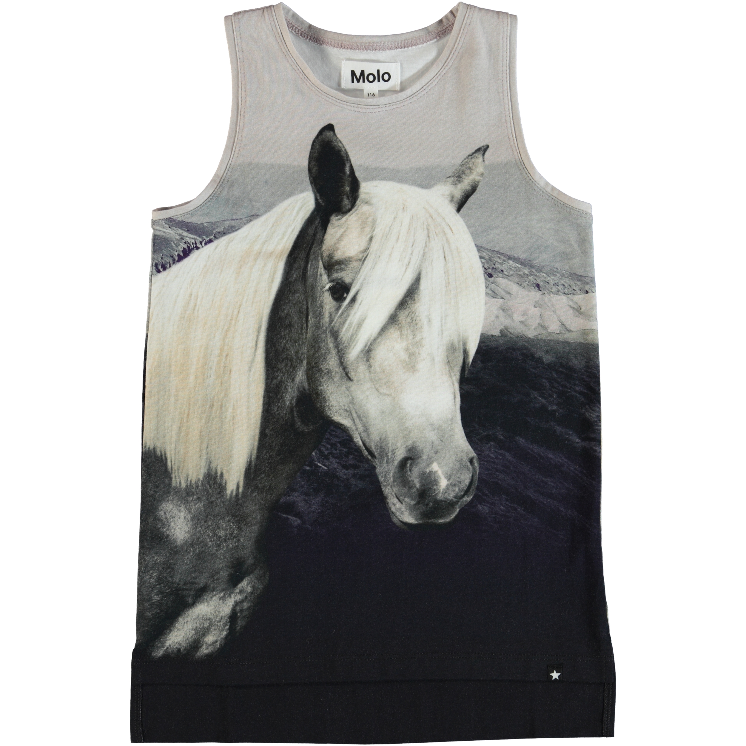 Losvallende top met een rond hals. Op de voorkant een groot paard.