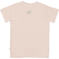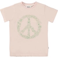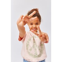 Road is een oudroze t-shirt van biologisch katoen met een groen vredesteken op de voorkant. Als je goed kijkt, zie je dat het vredesteken wordt gevormd door een heleboel vrolijke bloemetjes.